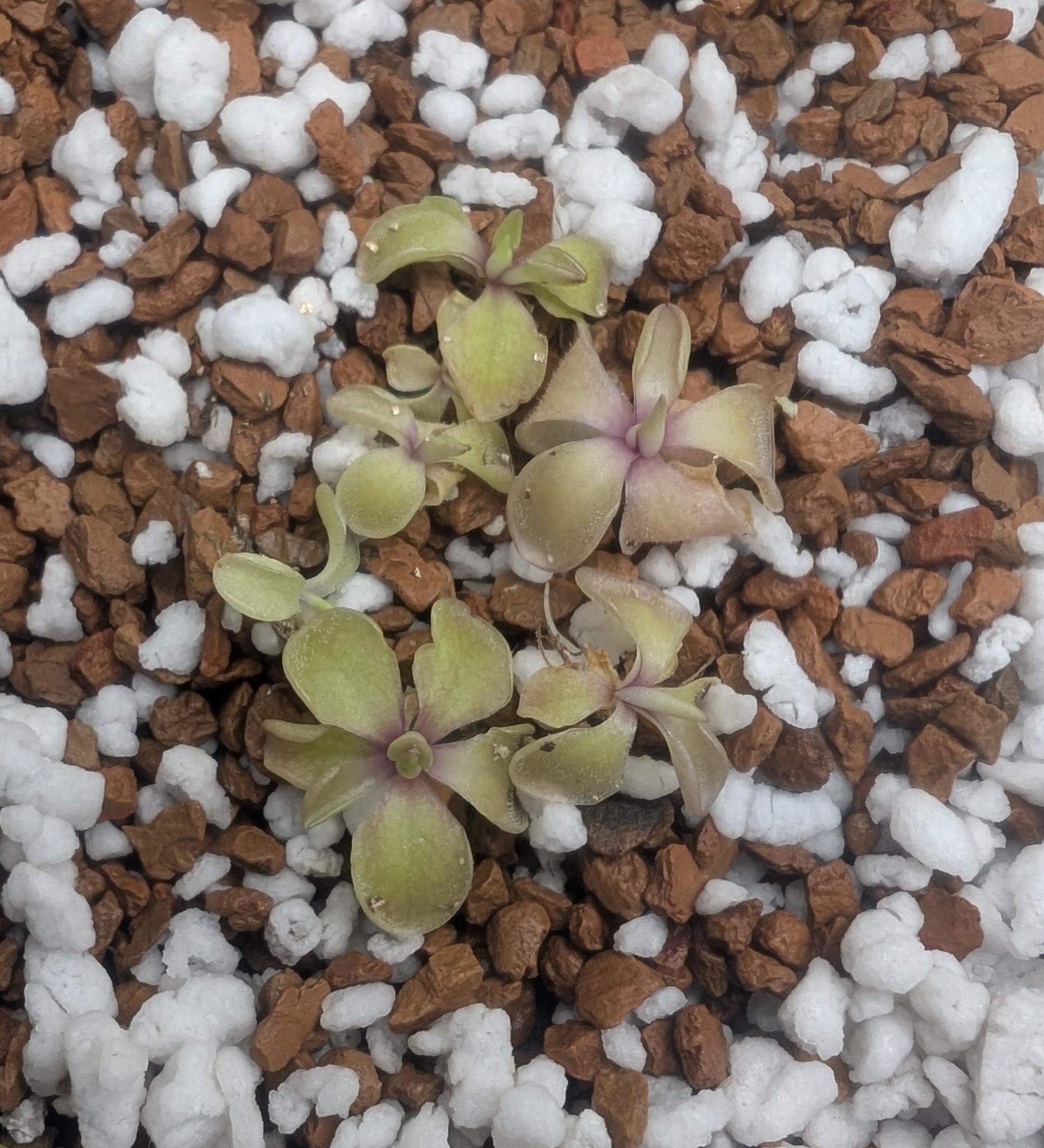 Have you ever wanted to own a biblically accurate angel? Pinguicula x “Phlogiston” may be the closest thing to it, if you stick some googly eyes on the pot! With its loops and rings of pink against the white background of the flower, it will make you dizzy if you aren’t careful! This plant is easy growing, easy propagating, and totally stunning to behold. It is also pretty easy to get it to bloom, so you can enjoy its dazzling beauty often. When grown under high light, the leaves turn a unique golden bronze. The first image is the bloom of a mature plant, and the second plants as sold.
