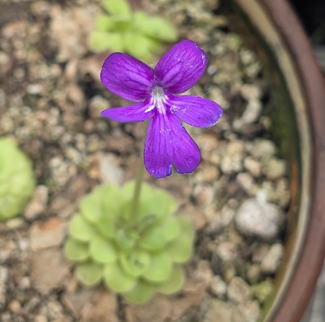 Catch a perfect pop of purple with this complex Pinguicula hybrid! This flower is just a little bit pinker than the classic blue-violet cyclosecta bloom. It is just a hair rounder in shape than a typical moranensis flower, although much larger and boxier than a typical cyclosecta. Its leaves are one of the best features of this plant! When grown under light, they truly become purple! Most pings will blush red, and other colors like bronze and purple are very special. They are also incredibly close to being circular in shape. It is rare to get a complex hybrid that is less than half cyclosecta. Generally, anecdotally, cyclosecta hybrids are unlikely to be fertile. Having this wonderful little plant that’s 3/4 moranensis and 1/4 cyclosecta is a real treat. Picture is a mature plant. Plants as sold are medium bare root.
